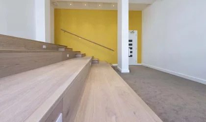 L’Atelier is a wooden floor and stairs workroom convenient for lectures, workshops, talks and creative games.